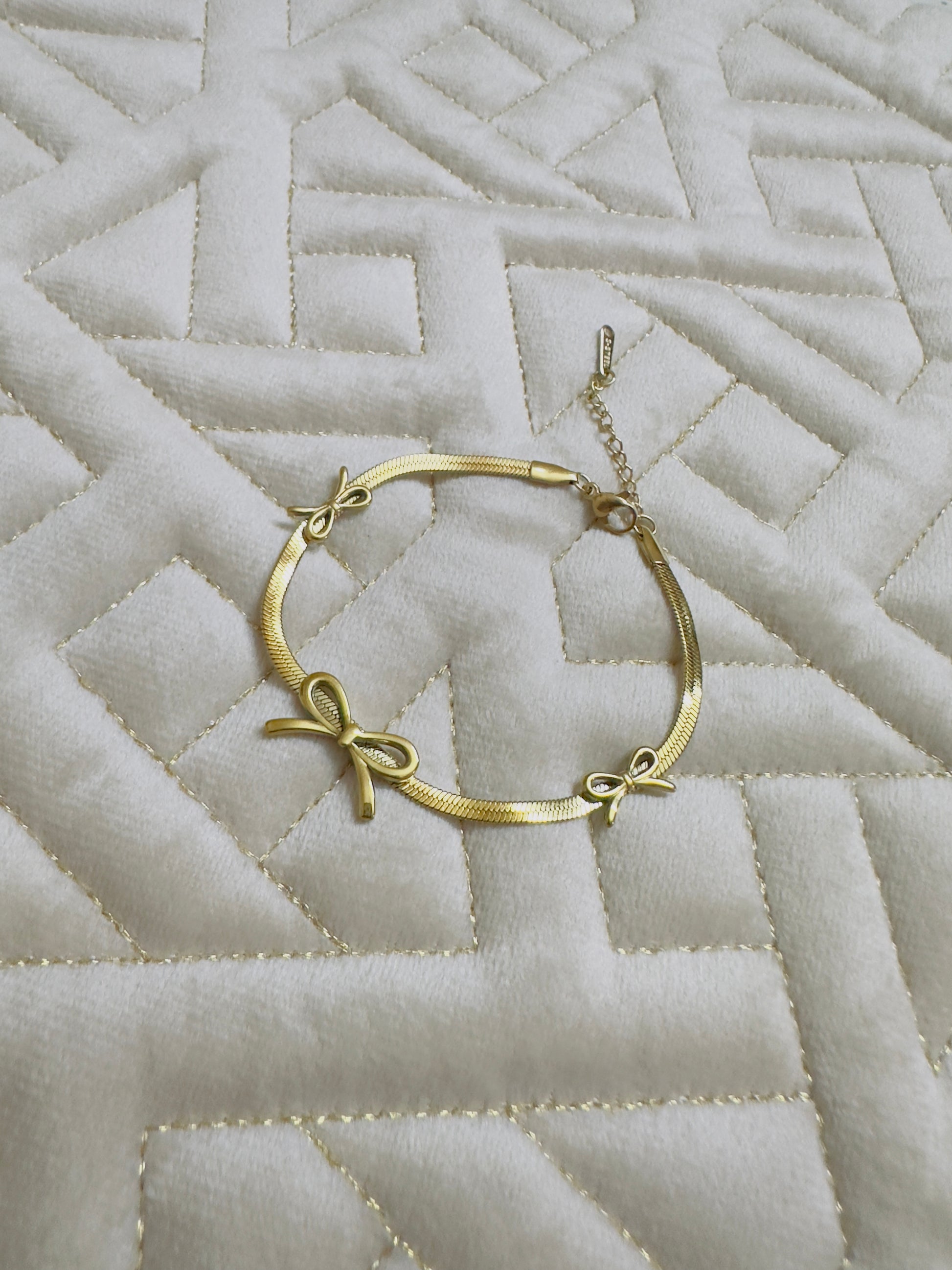 Soft, sweet, and stylish—the Bow Embellished Bracelet brings playful elegance to your stack. Featuring a delicate bow motif paired with a polished, adjustable snake chain, this piece is crafted from hypoallergenic materials for all-day comfort and shine. It adds a charming touch to both casual and dressy looks.