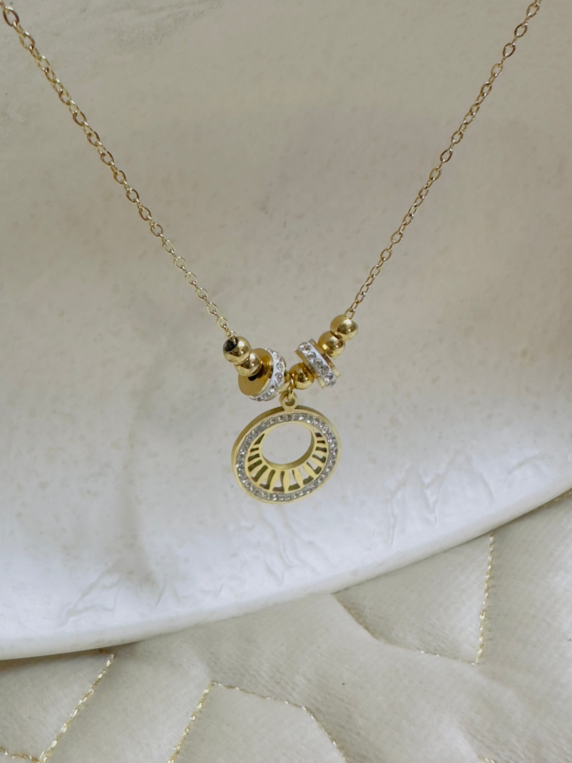 The Sun Halo Necklace features a glowing center stone surrounded by a soft, sculpted ring of gold — like the sun peeking through morning haze. Delicate yet radiant, it’s crafted in tarnish-resistant stainless steel with a luminous gold vermeil finish.